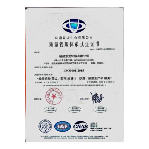 ? 標準化的產品質量管控 主起草《針織經編花邊》(FZ/T 73027-2016)國家紡織行業標準。 主起草《紡織品 2-甲氧基乙醇和2-乙氧基乙醇的測定》(GB/T 32612-2016)國家標準。 建立并實施標準化的國家CNAS認可檢測實驗室。 ? 嚴格的質量管理體系 嚴格實施“ZDHC”(有害物質零排放)的生產管理體系。 通過ISO9001質量管理體系認證、ISO4001環境管理體系認證、瑞士Oeko-tex standard 100生態紡織品認證。